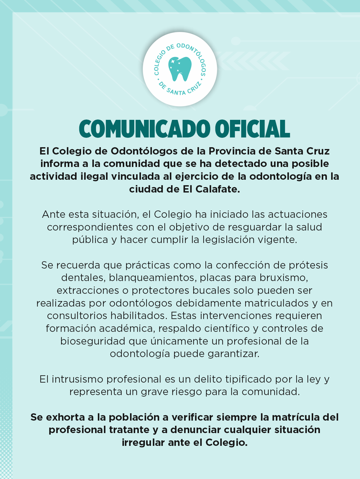 El Colegio de Odontólogos de la Provincia de Santa Cruz informa a la comunidad que se ha detectado una posible actividad ilegal vinculada al ejercicio de la odontología en la ciudad de El Calafate.